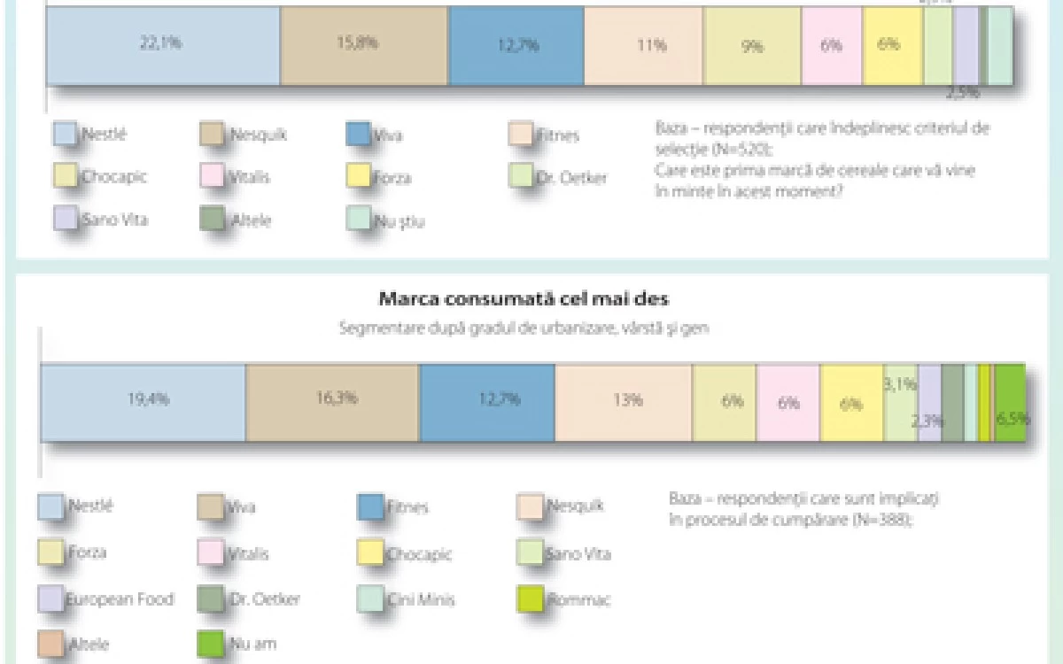 In timp ce optiunile barbatilor se continua cu Nesquik si Viva, la femei printre primele marci amintite se numara Fitness si apoi Viva. Potrivit studiului, preferinta pentru diverse marci de cereale se reflecta si la nivelul consumului. Astfel, Nestlé ramane conform preferintelor, cea mai consumata marca la nivelul tuturor categoriilor de varsta.